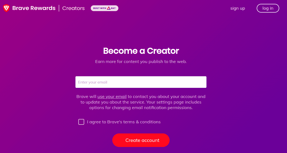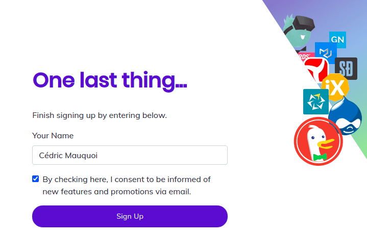 After entering your email address, you will receive an email from the Brave team, which you need to confirm. This will lead you to a page where you need to enter some basic information about yourself, as depicted below. Notice the cool collage of features from the Brave browser, such as the DuckDuckGo duck or the Tor onion.