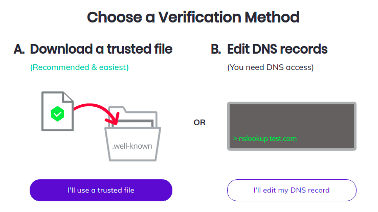 Now you can either choose the trusted file setup, or the DNS record way. Since I do have access to my DNS records, and this setup is even easier (I think) if you’re hosted on Netlify (which you are, if you’ve been following the blog), I will do the DNS way.