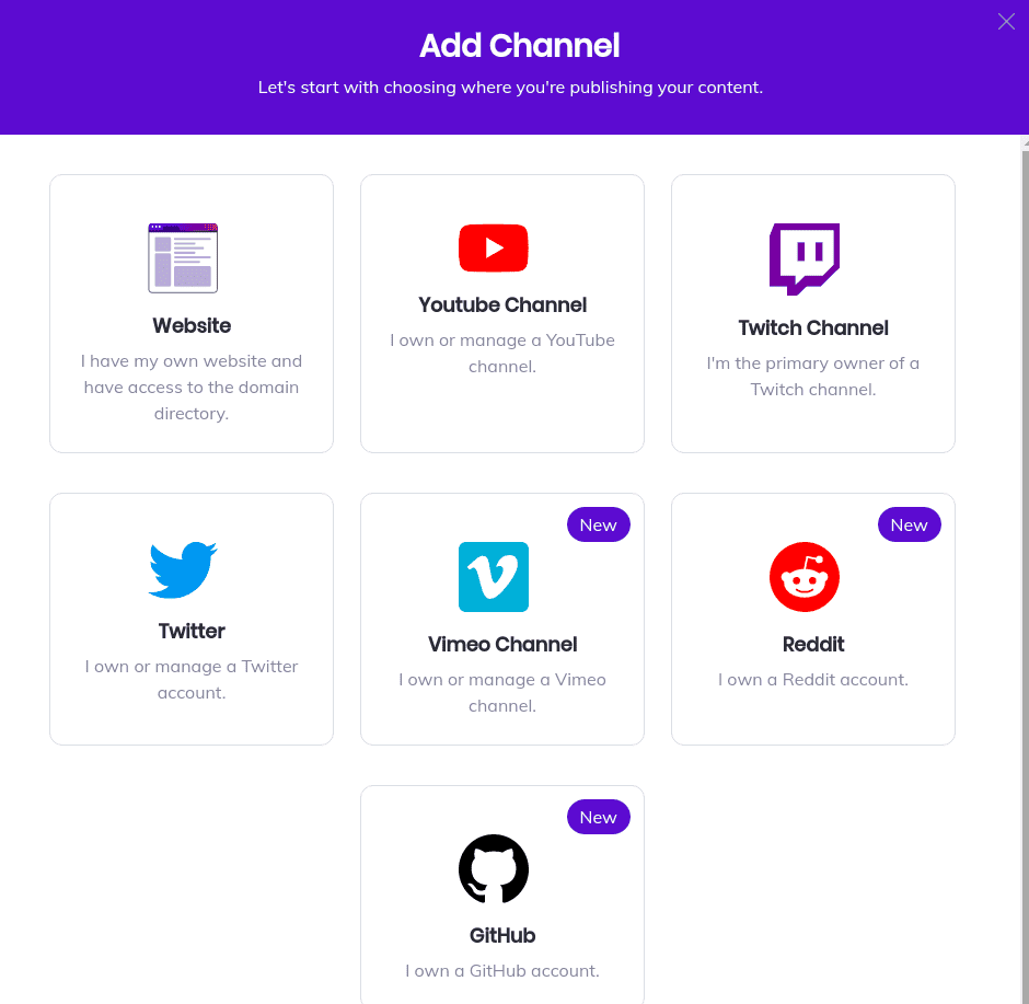 In order to add your blog, you just click on the Add Channel button. This will give you the selection of items that you can receive tips for. I was very surprised to notice the variety! I made this article to show how you can become a creator with a website, but I will definitely add my GitHub account to it also. I am not expecting a big payout (or even anything for that matter, but it cannot hurt to try).